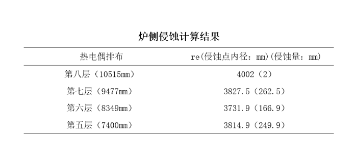 中陽(yáng)鋼鐵1#高爐投產(chǎn)一年后,利用一維穩(wěn)態(tài)導(dǎo)熱模型對(duì)爐底爐缸侵蝕量進(jìn)行測(cè)算,結(jié)果表明:爐缸側(cè)壁侵蝕量最大為263mm,象腳區(qū)為250mm,爐底侵蝕量最大為70mm。